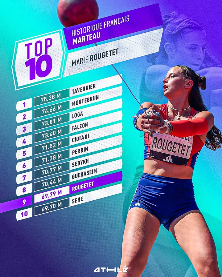 🇲🇫 Marie Rougetet a pulvérisé son record de plus de deux mètres en réalisant 69,79 m au lancer du marteau samedi à Gainesville, aux Etats-Unis.