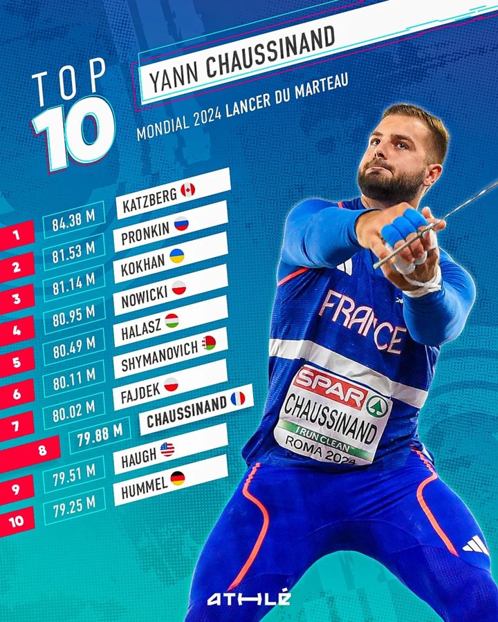 đ Les Bleus dans le TOP 10 au bilan mondial 2024 : Yann Chaussinand 8e au lancer du marteau !