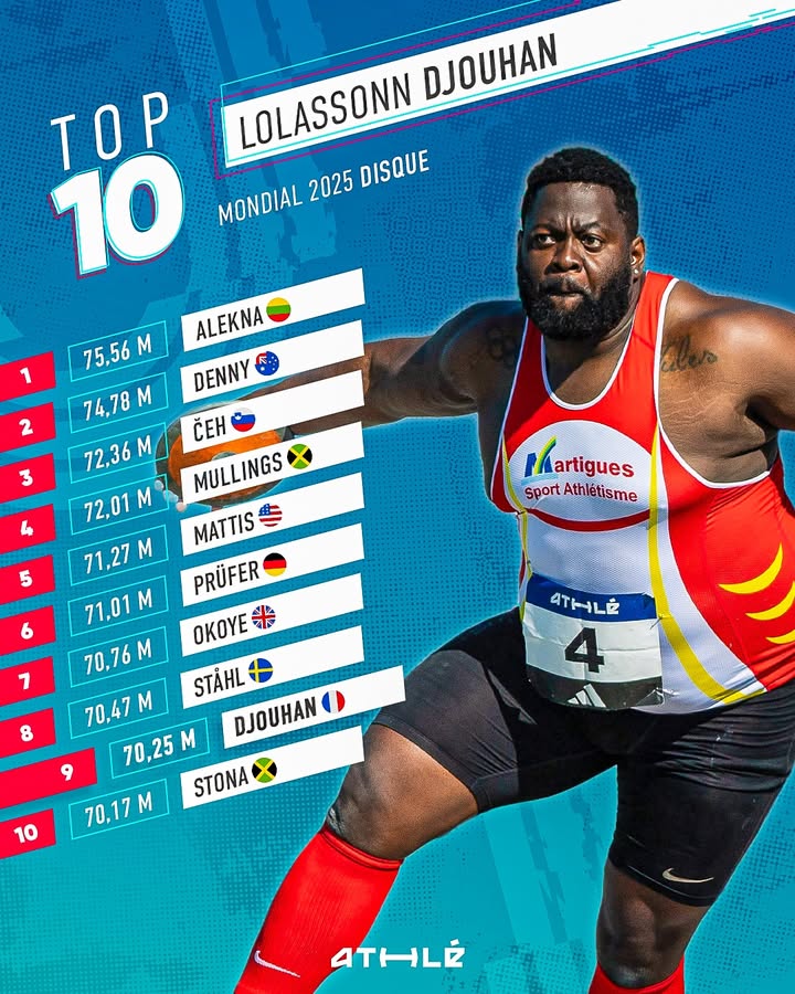 📊 Les Français dans le TOP 10 au bilan mondial 2025 : Lolassonn Djouhan 9e au lancer du disque !